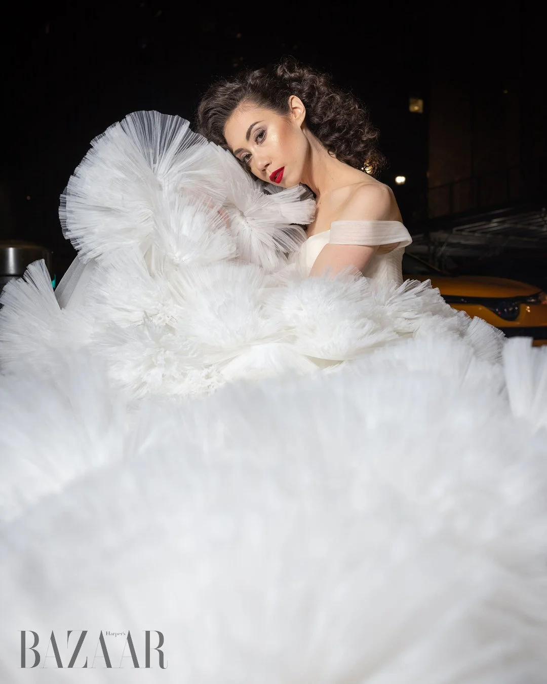 Woman wearing a voluminous white dress with ruffled layers. She's standing against a dark background, with a yellow taxi partially visible. "Harper's Bazaar" logo in the corner.